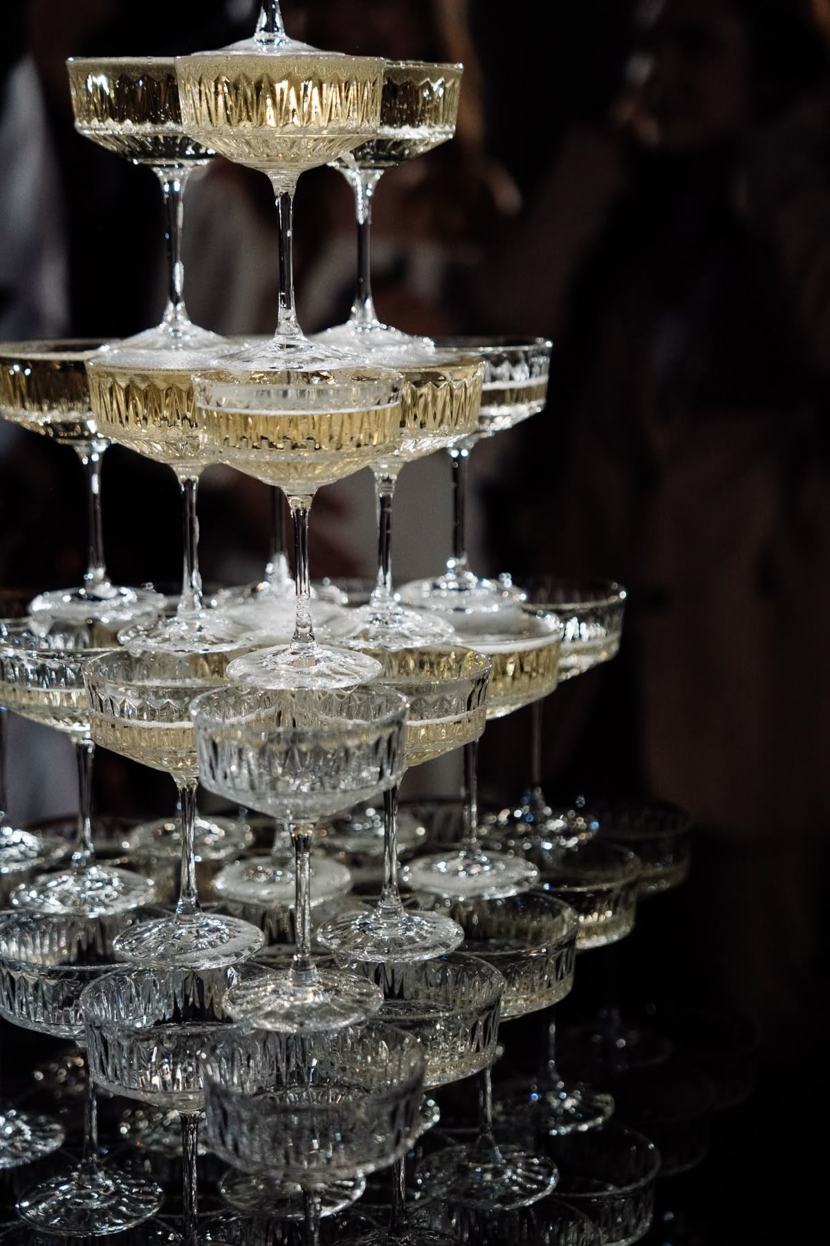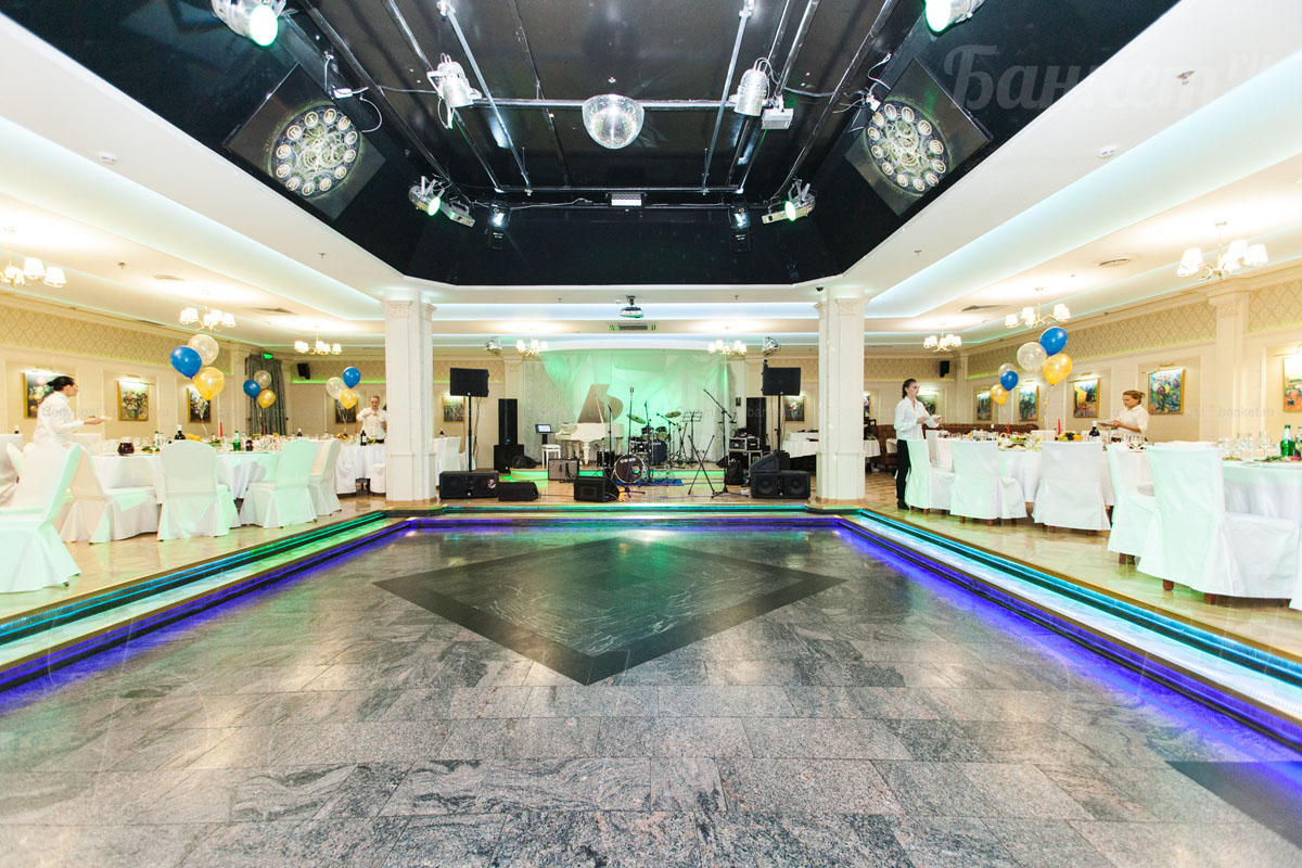 костюмах,а дам - в вечерних платьях.